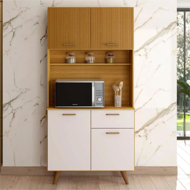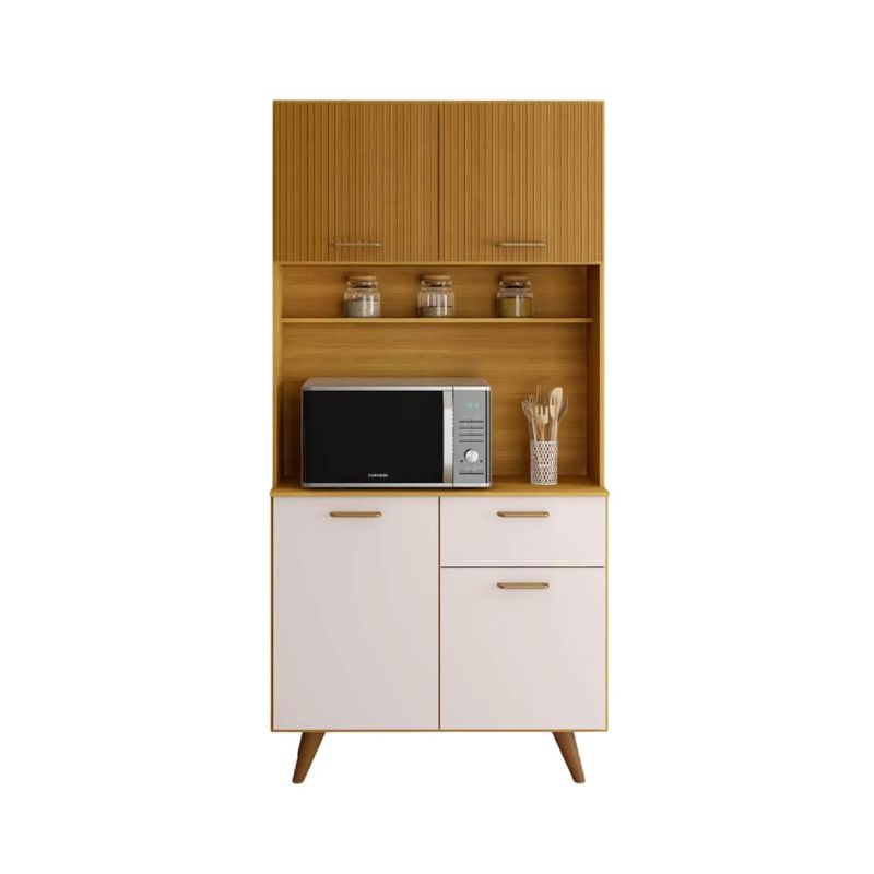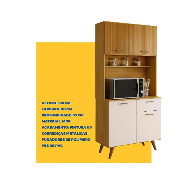 Um produto amplo e versátil, podendo ser utilizado como complemento de cozinha ou peça única. Possui 4 portas de bater, 01 gaveta com corrediças metálicas, dobradiças metálicas 26mm, nicho organizador decorativo, espaço para dispor aparelhos e utensílios domésticos, puxadores em polímero ouro fosco e pés retro modelo palito PVC reguláveis 18cm que permitem o nivelamento perfeito. Produto em MDP com portas em pintura UV