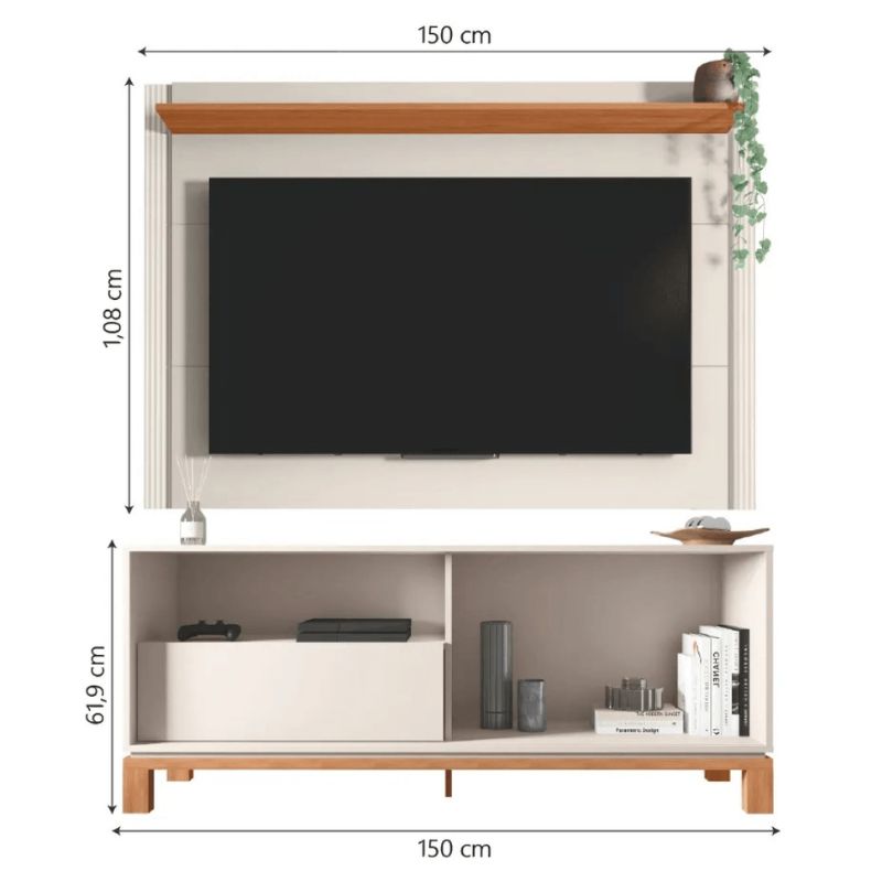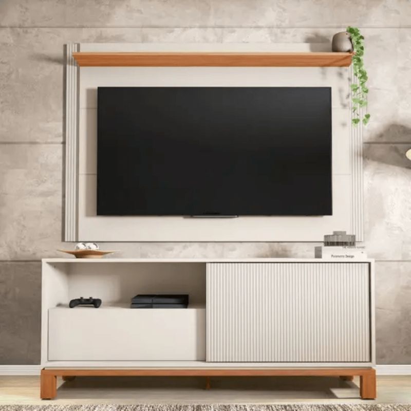 Rack com Painel Caemmun Mondrian valoriza qualquer sala com seu design moderno e funcional. O painel extensível permite flexibilidade de largura na montagem, enquanto o acabamento Off White com detalhes em Freijó confere charme e sofisticação ao ambiente.
