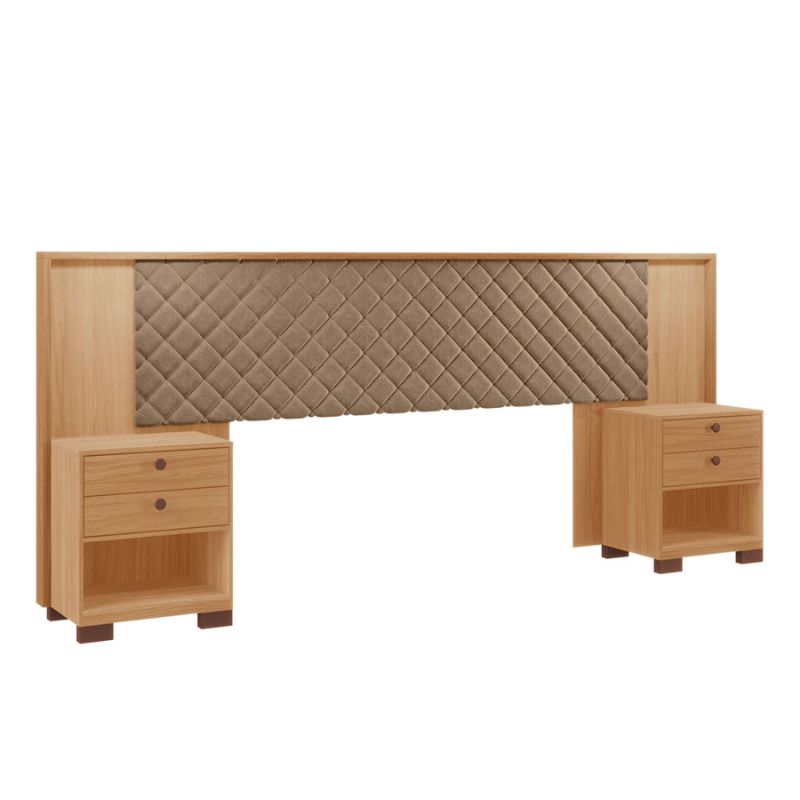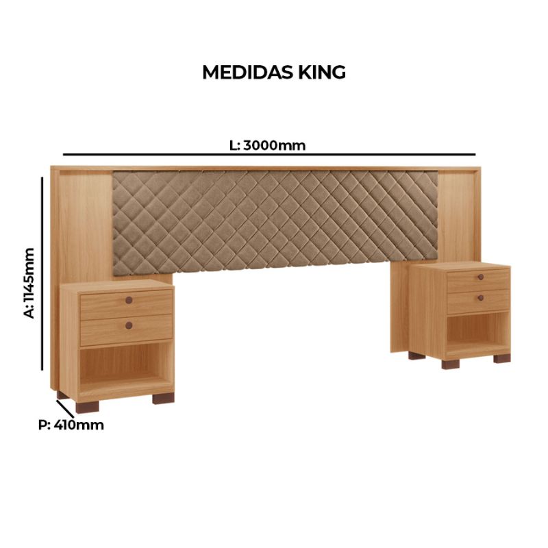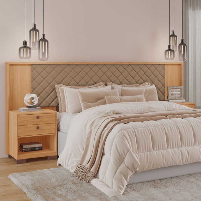 Cabeceira Box Aurora da Tuboarte Móveis. O seu tamanho é regulável para se adequar a camas Queen e King. 100% MDF, possui 02 (duas) Mesas de Cabeceira, com 02 (duas) gavetas cada. Possui também, um detalhe em MDF, deixando o produto ainda mais estiloso.