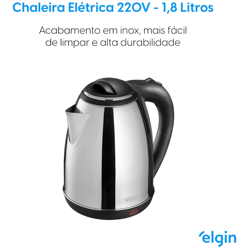 A chaleira Elétrica Elgin possui design moderno com acabamento em inox, o que facilita a limpeza e garante maior durabilidade, capacidade de até 1,8 litros para o preparo de chás, cafés e até sopas, legumes e outros alimentos, tem indicação visual de funcionamento e para aumentar sua segurança, possui proteção antifuncionamento sem água e sistema de desligamento automático para quando a água atinge a temperatura ideal, além de Indicador luminoso de funcionamento. A jarra sem fio que garante muito mais praticidade para transportar e levar sua chaleira para qualquer lugar. Para maior rapidez na preparação da sua bebida preferida, a Chaleira Elétrica Elgin é o modelo ideal. A Elgin oferece garantia expressa de 1 ano para você usar sua chaleira sem preocupação.