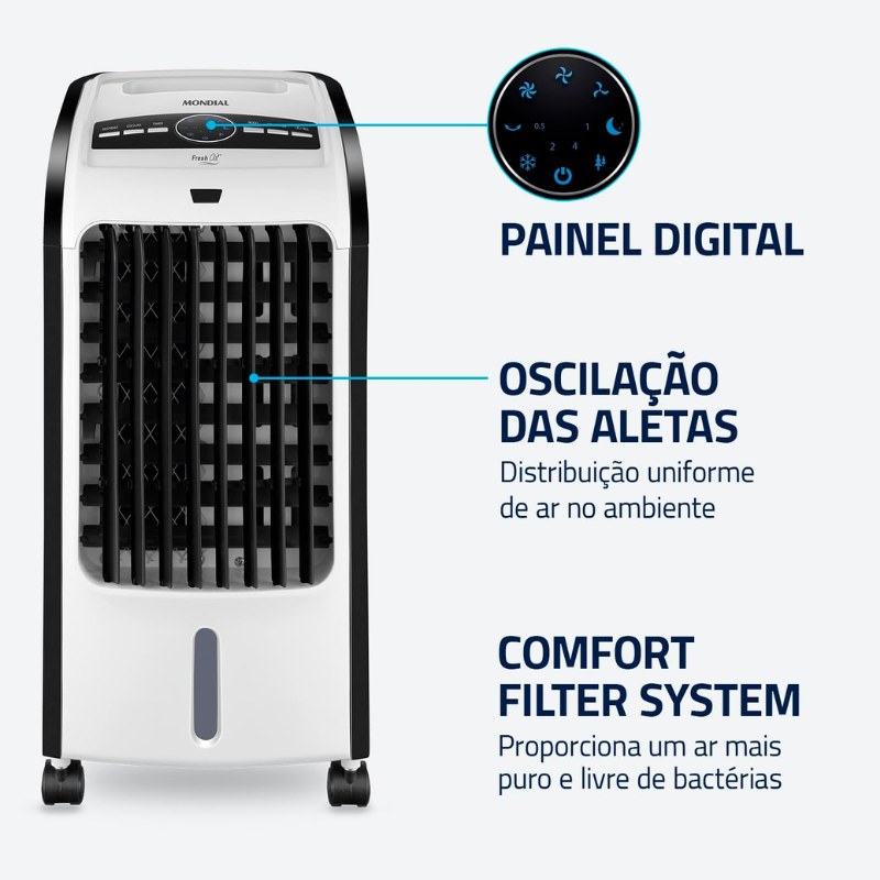 4 EM 1: O climatizador Mondial resfria, umidifica, filtra e ventila o ambiente, garantindo um cômodo fresco e confortável.