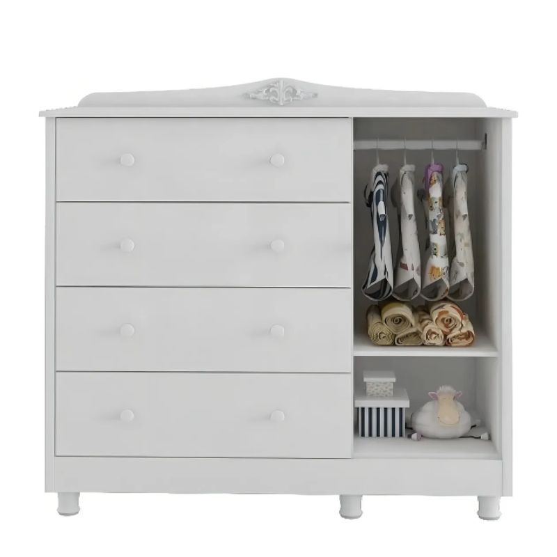 A Cômoda Infantil Elô combina funcionalidade com um visual delicado para o quarto do bebê. Fabricada em MDF com pintura UV atóxica, oferece resistência e segurança. Possui 1 porta, cabideiro metálico, prateleira interna e 4 gavetas com corrediças telescópicas que suportam até 4kg cada. Os puxadores pontuais em plástico e os pés plásticos completam o design prático e moderno. Com amplo espaço interno, é perfeita para manter tudo organizado com charme e eficiência.