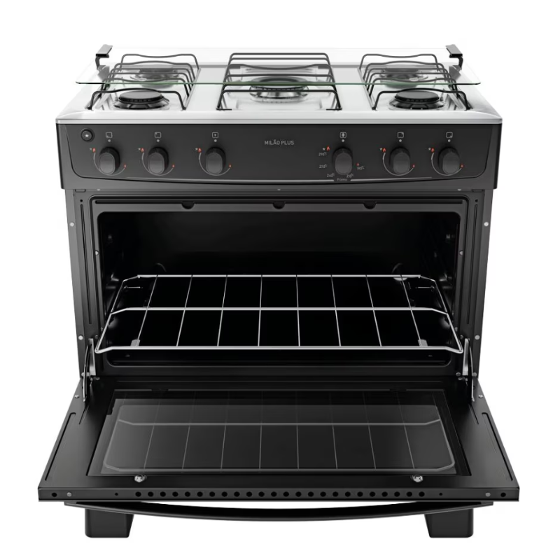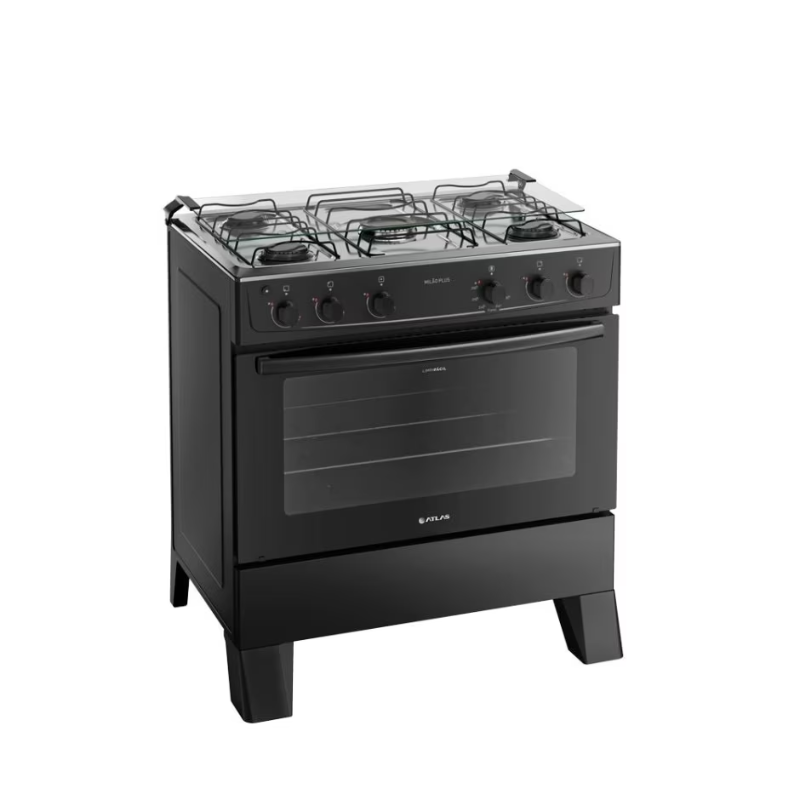 O Fogão Atlas Milão Plus é prático, fácil de limpar e bonito, ideal para sua cozinha! A tampa de vidro protege contra respingos, mantendo a cozinha organizada. Chega montado e pronto para uso, com acendimento “girou, clicou, acendeu”, dispensando fósforos. Seus pés altos facilitam a limpeza, e sua estrutura firme garante durabilidade. Os queimadores e o forno Limpa Fácil são esmaltados, facilitando a limpeza. A versão com 5 bocas inclui um queimador megachama.