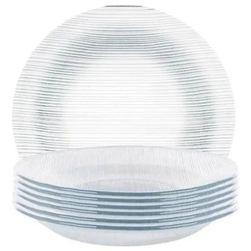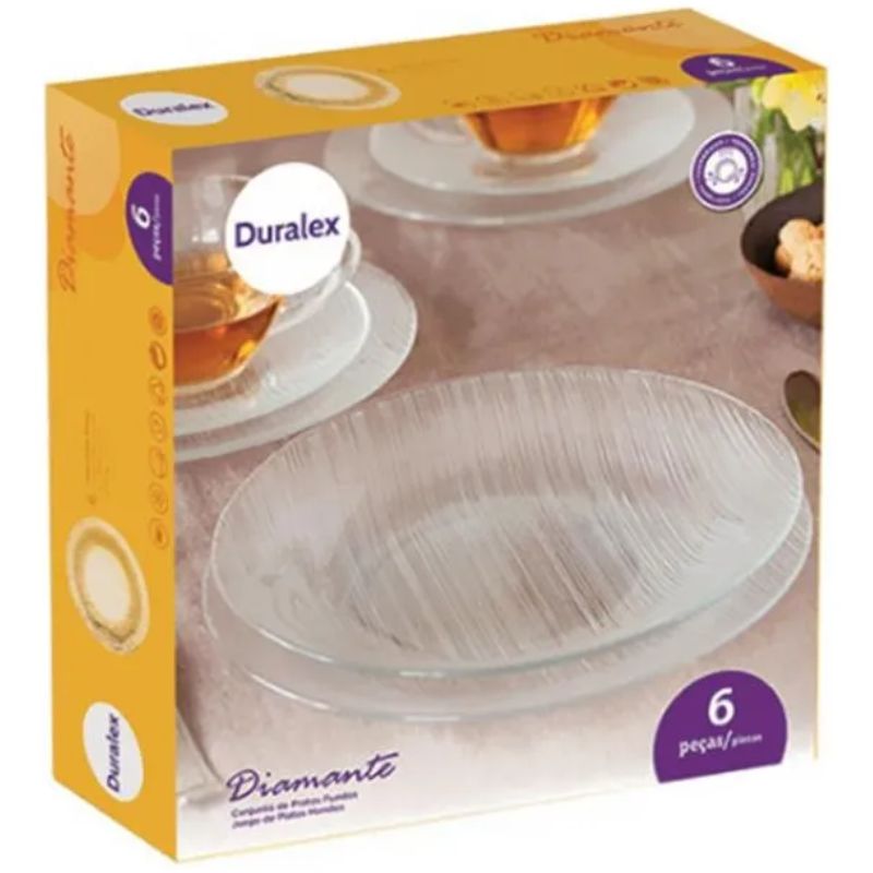 Apresentamos o Jogo com 6 Pratos Fundo Diamante. Com um design elegante em vidro transparente, cada prato possui um diâmetro de 22,5 cm, ideal para servir refeições em qualquer ocasião, desde jantares familiares até refeições mais formais. A linha Duralex Diamante combina beleza e durabilidade, tornando cada refeição uma experiência única.