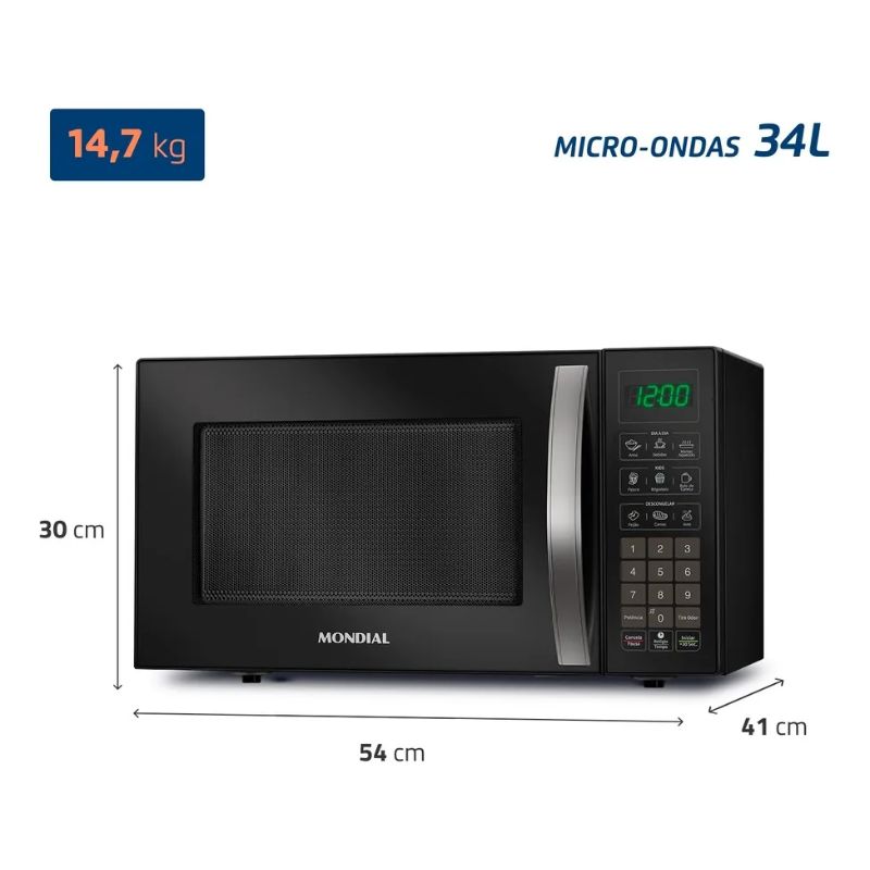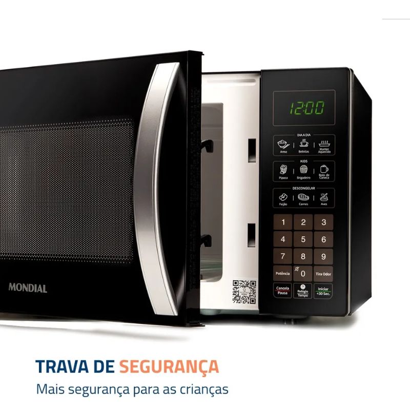 O Micro-ondas Preto da Mondial é sofisticado, eficiente e possui funções que facilitam sua vida na cozinha! Tem capacidade de 34 litros, 1.400W de potência, Display Digital e funções como Menu Dia a Dia, que oferece opções rápidas para refeições cotidianas, e Menu Kids, com receitas especiais para crianças. Oferece a flexibilidade necessária para cozinhar, aquecer e descongelar uma variedade de pratos, desde refeições rápidas até pratos mais complexos. É ótimo para preparar alimentos em pratos, recipientes e refratários. Com alta potência, você prepara e descongela seus alimentos com mais rapidez e eficiência, facilitando sua rotina diária. A praticidade de descongelar alimentos de forma rápida e fácil, com apenas um toque. Mantém seu prato na temperatura ideal até o momento de servir, garantindo sempre uma refeição quente e saborosa. Com 10 níveis de potência, você pode ajustar facilmente a intensidade para cozinhar, aquecer ou descongelar seus alimentos de forma eficiente. Mantenha seu forno micro-ondas limpo por mais tempo, eliminando os odores indesejados das refeições anteriores. A função de trava de segurança proporciona tranquilidade, impedindo que as crianças utilizem o micro-ondas sem supervisão. Baixo consumo de energia: selo com classificação A de economia.