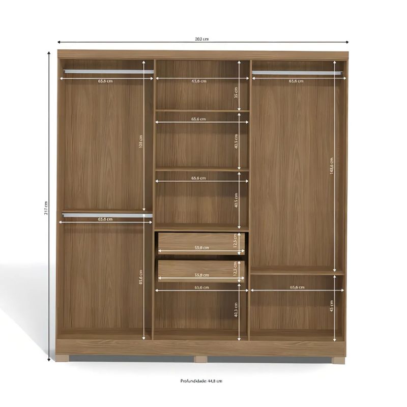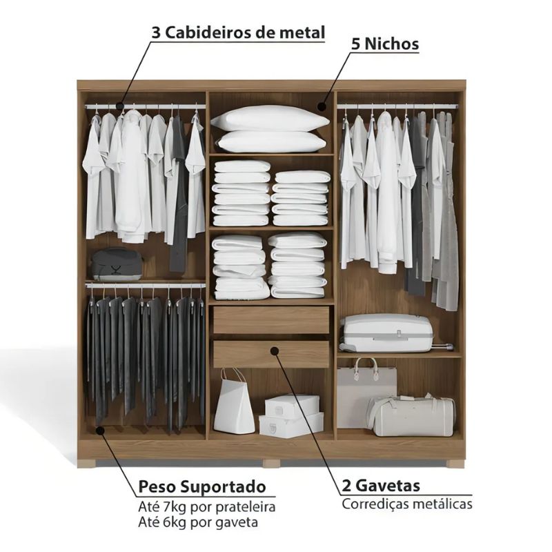 Guarda-roupa Casal para quem busca funcionalidade e design moderno em um só móvel. Estrutura em MDP (12 mm) e acabamento em pintura UV, conta com 6 portas, 3 cabideiros metálicos, 3 prateleiras e 2 gavetas internas com corrediças metálicas.